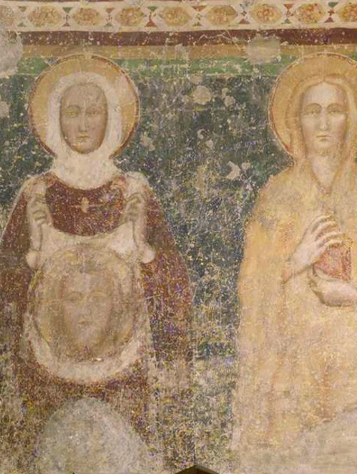 Il sottocoro fu realizzato nel 1537, quando si decise di anticipare l’altare maggiore. Le sue volte sono sostenute da colonnine provenienti da edifici più antichi. Durante un restauro condotto nel 1929, vennero riscoperti gli affreschi che decorano l’ambiente, tra cui una teoria di santi che presenta anche santa Veronica. Sotto ciascun santo è riportata la data della rispettiva festa liturgica, il 12 febbraio per la Veronica. Si tratta di uno degli ultimi calendari che presenta la donna, la cui festa verrà espunta nel 1582, dal nuovo martirologio romano voluto da papa Gregorio XIII, su richiesta del cardinale Baronio. La rimozione verrà contestata solo dai Bollandisti francesi. Nello stesso periodo anche san Carlo Borromeo tolse santa Veronica dal calendario Ambrosiano che era stato il primo ad attestarne il culto, riportando la memoria di santa Veronica già nel XII secolo.