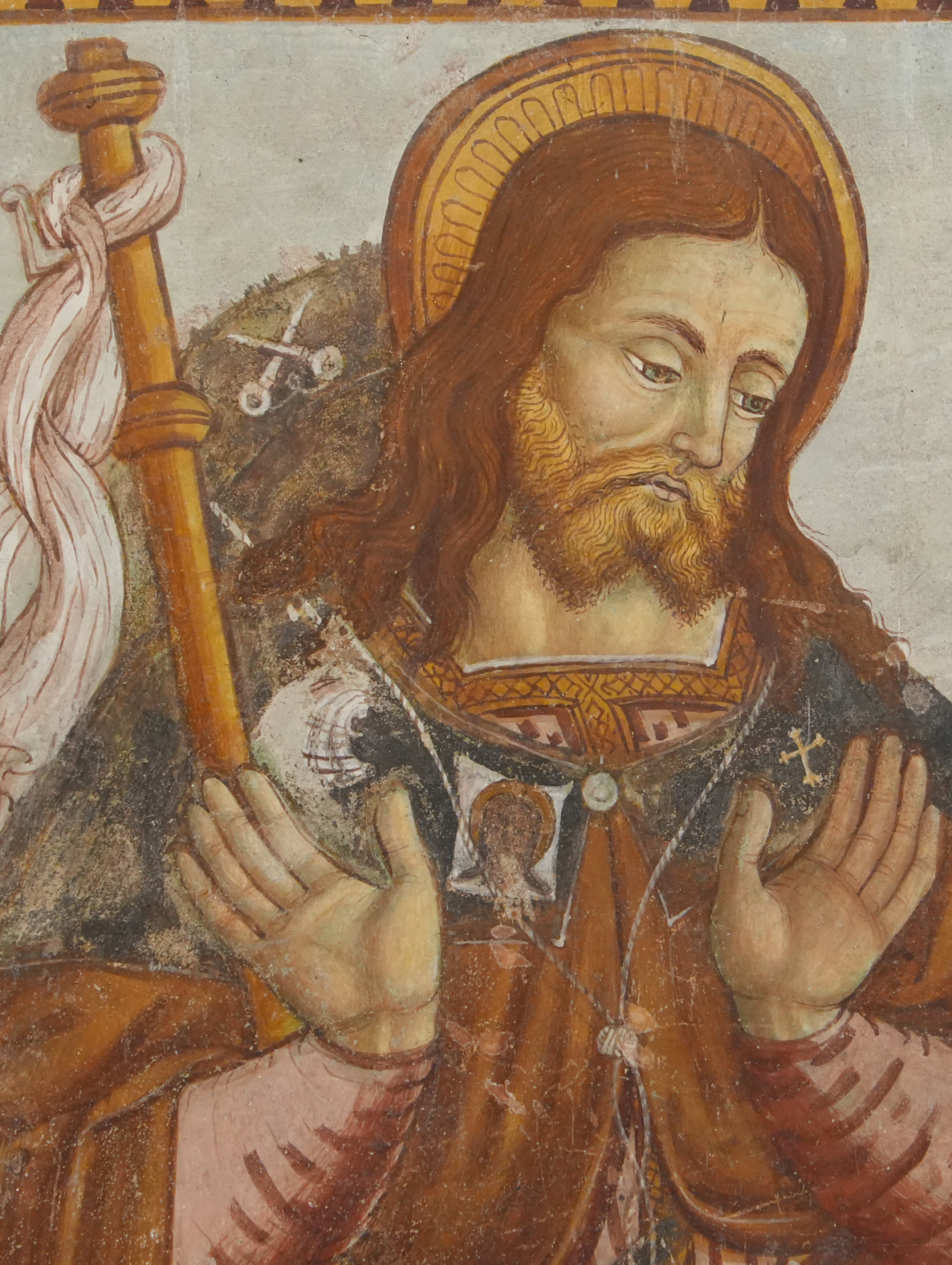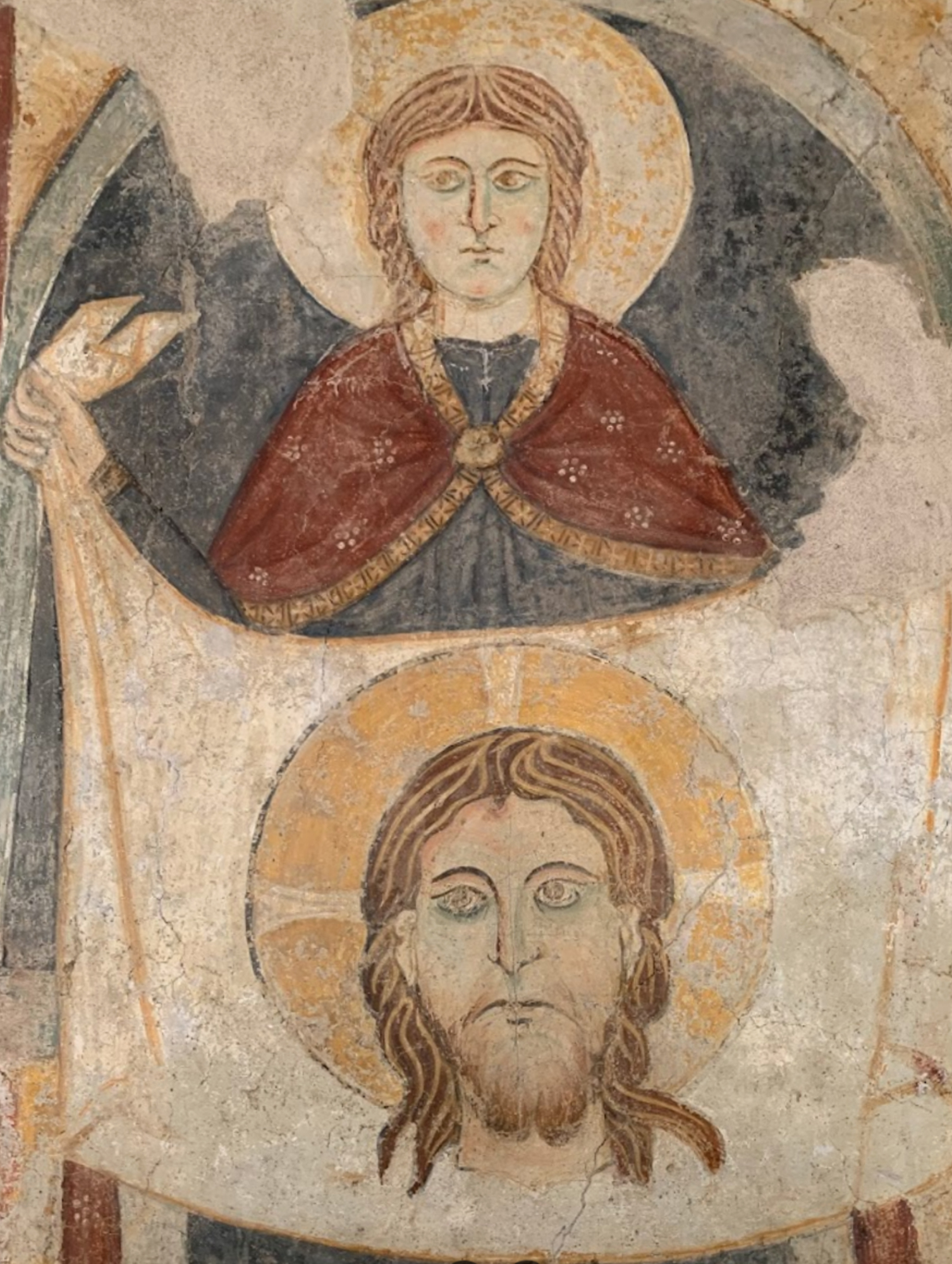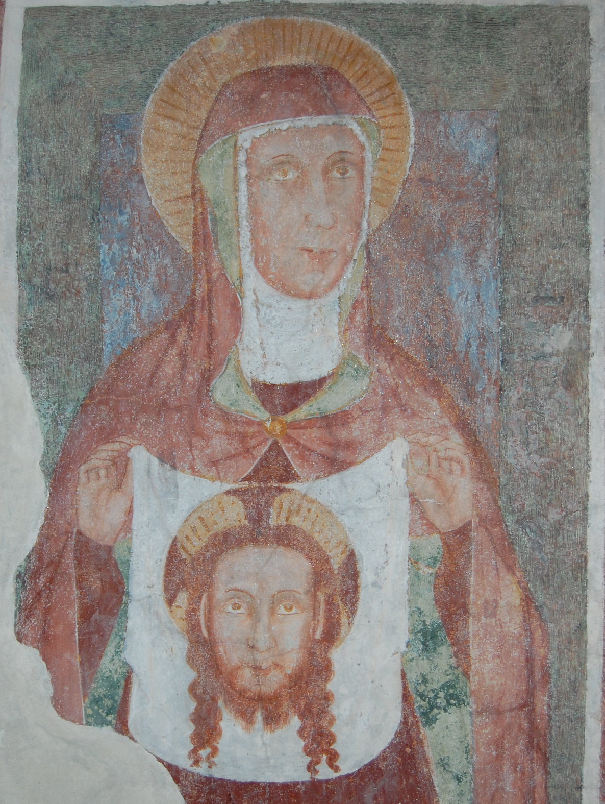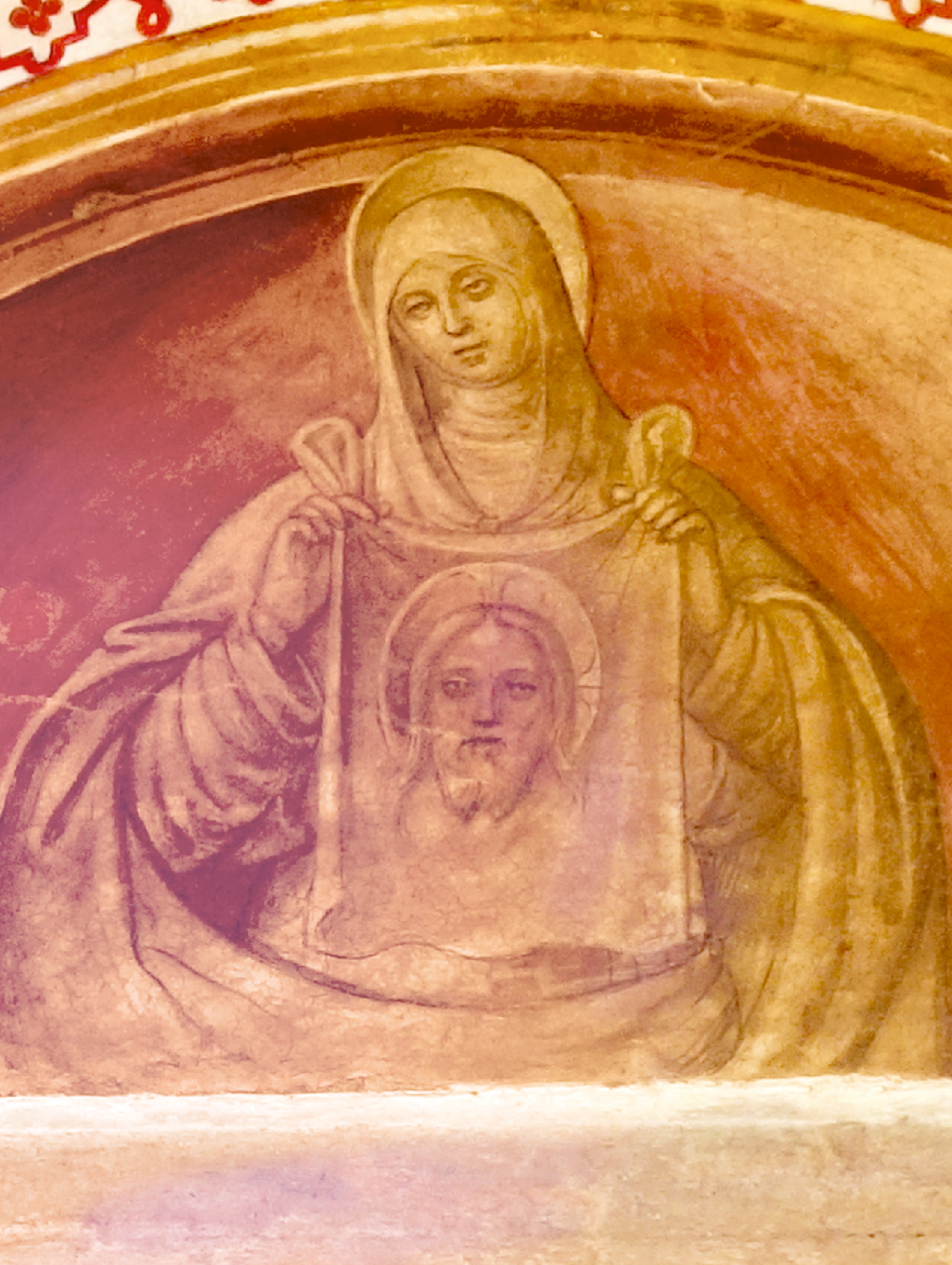 L’affresco è stato attribuito a Carlo Urbino, che nel 1575 fu incaricato della decorazione della cappellina degli angeli, affacciata al sottocoro. Santa Veronica è raffigurata in piedi con una tunica bianca coperta da un manto rosso. Sul capo porta un velo chiaro, simile al piccolo sudario che ostende con impresso il volto di Cristo. L’affresco è molto deteriorato: i lineamenti di Cristo sono appena distinguibili, presenta gli occhi aperti, la barba bipartita, la corona di spine e i rivoli di sangue che gli segnano la fronte. La tavolozza luminosa e lo stile corsivo dell’opera riflettono l’abilità dell’artista cremasco nel disegno, evidente nella grazia e leggerezza con cui ha reso le mani della santa.